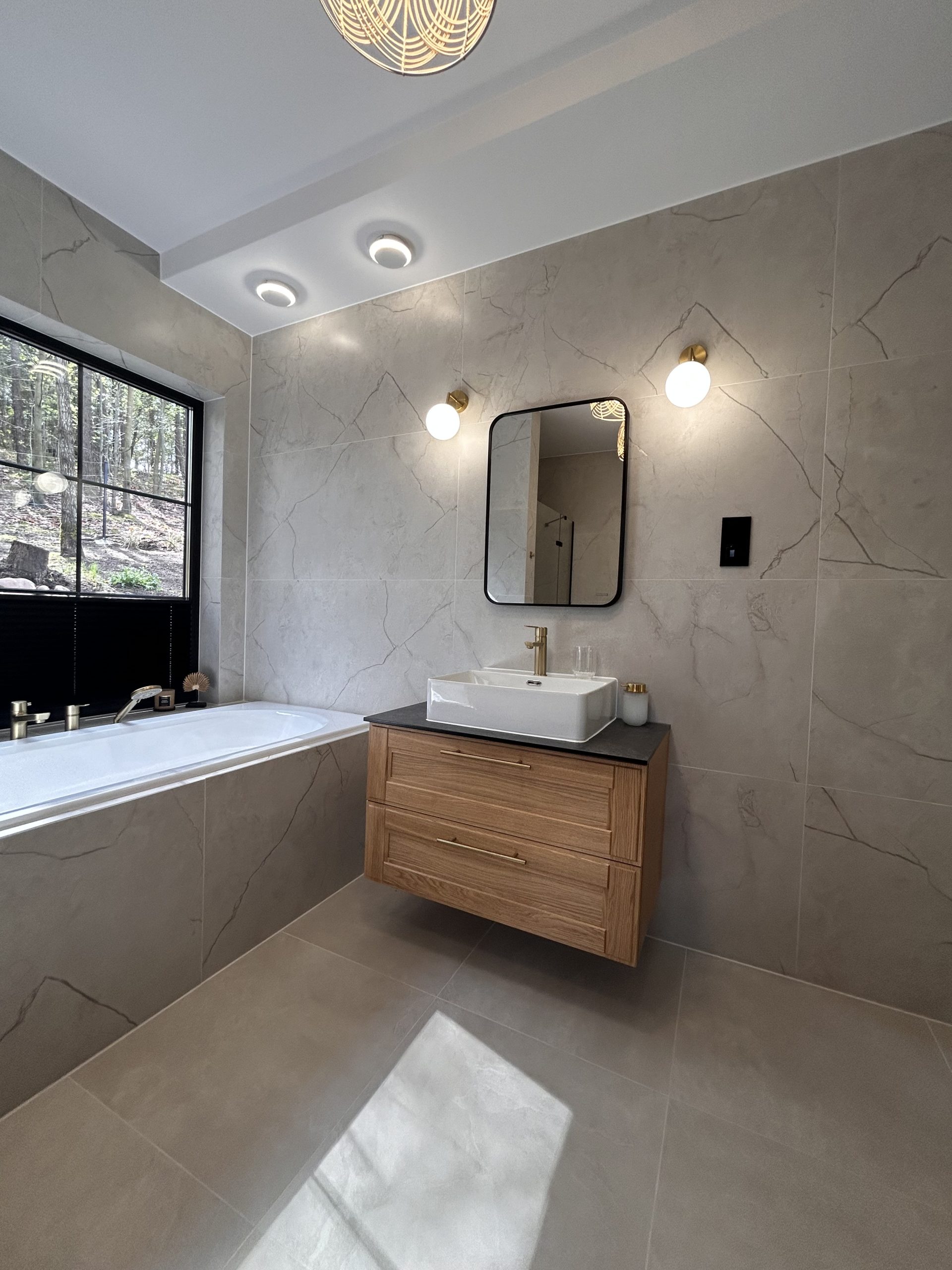 - Badezimmer mit Toilette, Dusche und Badewanne mit Blick auf den Wald, mit Fußbodenheizung