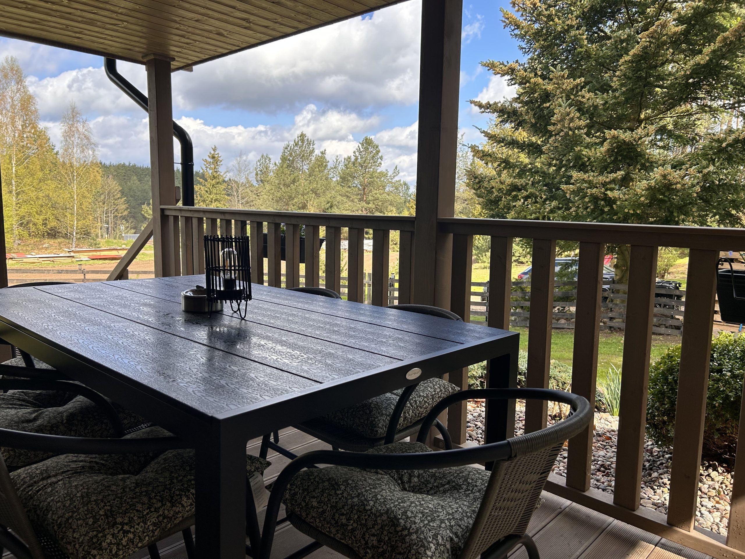 - große überdachte Terrasse mit Blick auf Felder und Wälder