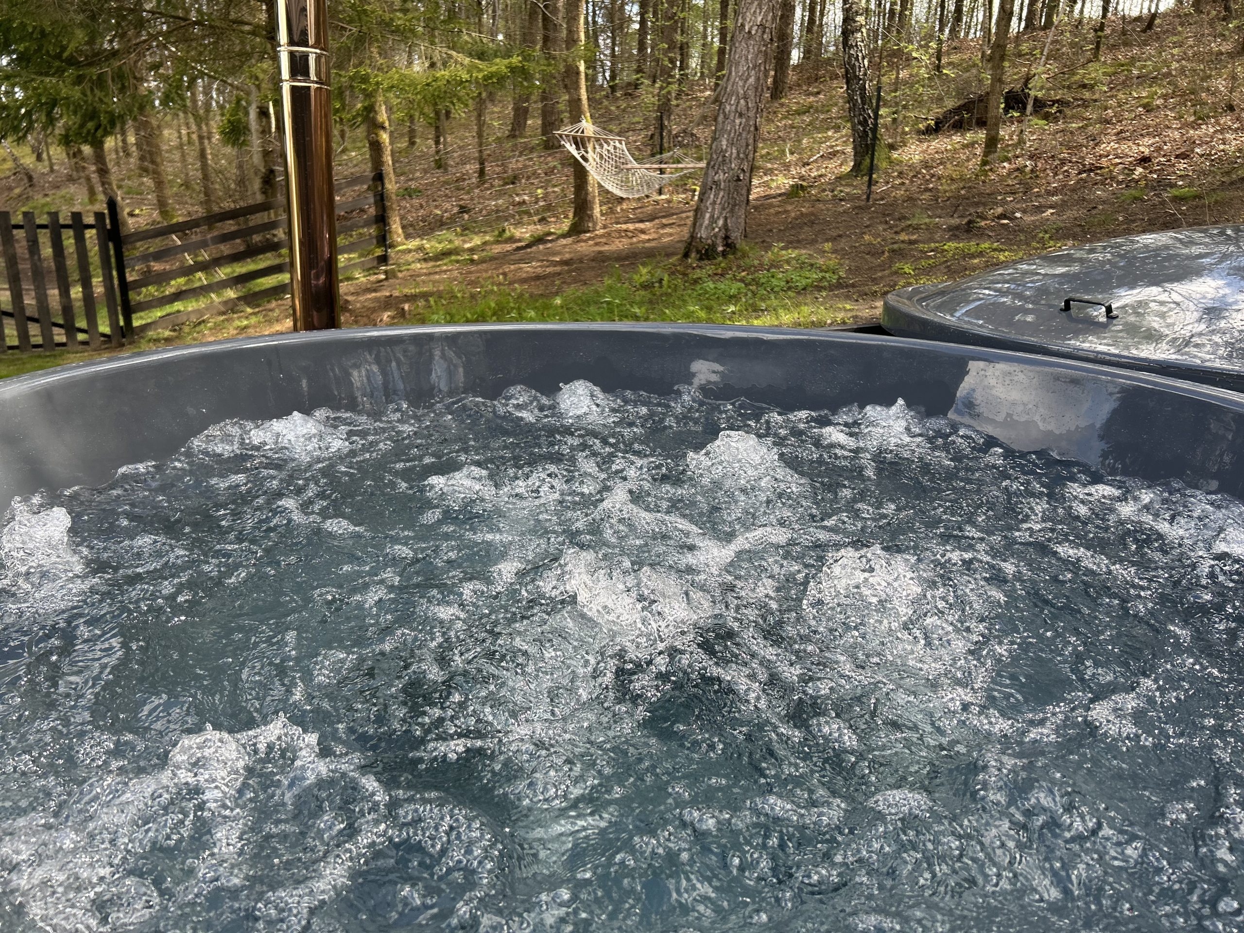 Entspannung in einem heißen Fass mit einem Glas Wein